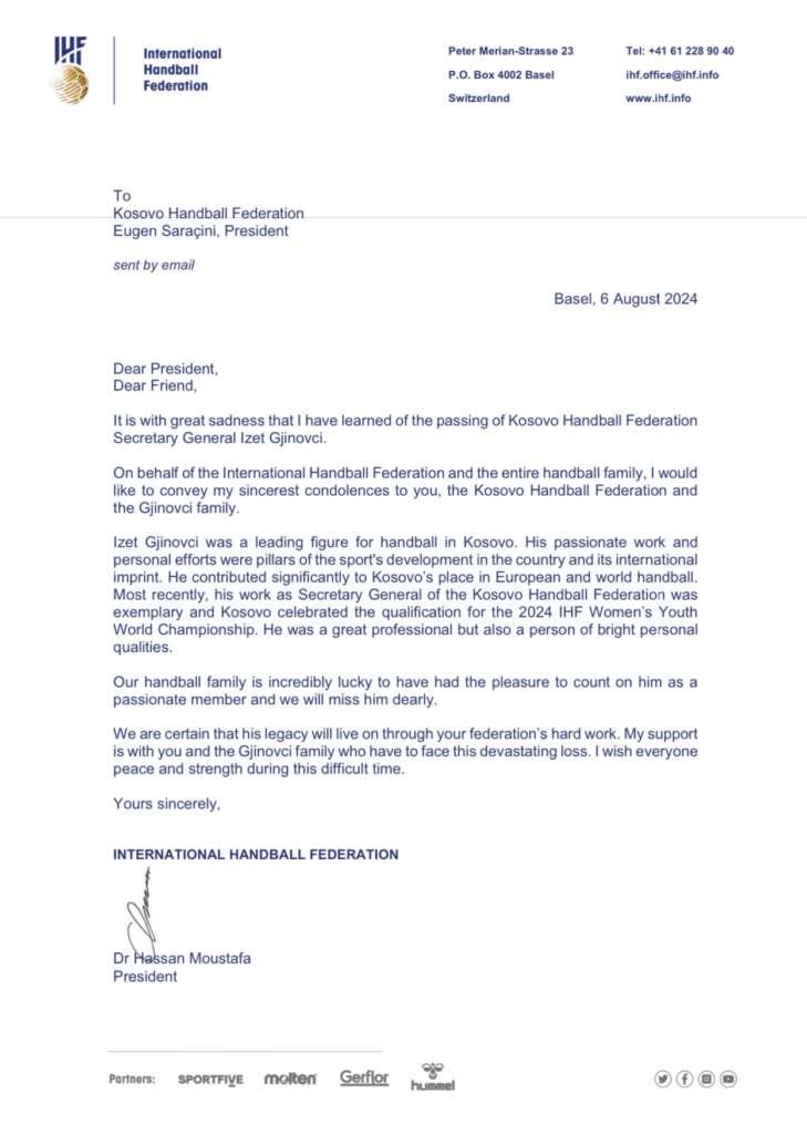 Familja jonë e hendbollit është jashtëzakonisht me fat që ka pasur kënaqësinë të llogarisë tek ai si një anëtar i pasionuar. Do të na mungoj shumë. Jemi të sigurt se trashëgimia e tij do të jetojë përmes punës së palodhur të federatës suaj. Mbështetja ime është për ju dhe familjen Gjinovci e cila duhet të përballet me këtë humbje të madhe. U uroj të gjithëve paqe dhe forcë në këtë kohë të vështirë”, shkruan në telegramin e presidentit të IHF-së, Hassan Moustafa.